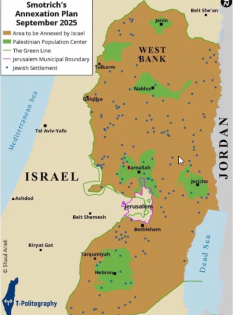 This is fascist Israeli government minister Bezalel Smotrich’s Annexation Plan for the Occupied West Bank. He calls it “Annexation,” but what it really is is “Ethnic Cleansing.” Note that the plan is to concentrate the largest number of Palestinians into 5 major urban “Population Centers” – in and around Ramallah, Jericho, Hebron, Nablus, and Jenin. This is the latest iteration of what Jeff Halper, Israeli anthropologist and long-time activist for Palestinian justice, has called “the matrix of control.” Note also the “dots” scattered everywhere throughout the West Bank. These are Israeli “settlements,” better described as “colonies.” The current population of these Palestinian cities and their immediate surroundings is about 1.5 million. The plan is to ethnically cleanse the rest of the West Bank Palestinians from small villages, drive them into these “ghetto-cities,” and steal their land in the rural areas. Settlers are currently waging a guerilla-style war on isolated, defenseless West Bank villages, burning the olive groves, demolishing Palestinian homes, and seizing the land. This will increase. The “dots” will increase. The “facts on the ground” will expand. Smotrich’s plan is for this to become “the new normal.” It is incumbent upon all of us, on people of conscience throughout the world to resist the normalization of this horrific injustice. What we need is a coordinated global “anti-normalization” campaign, as described by Palestinian activist and advocate Sam Bahour and Israeli activist and advocate Jeff Halper. More about this in subsequent VJP newsletters.