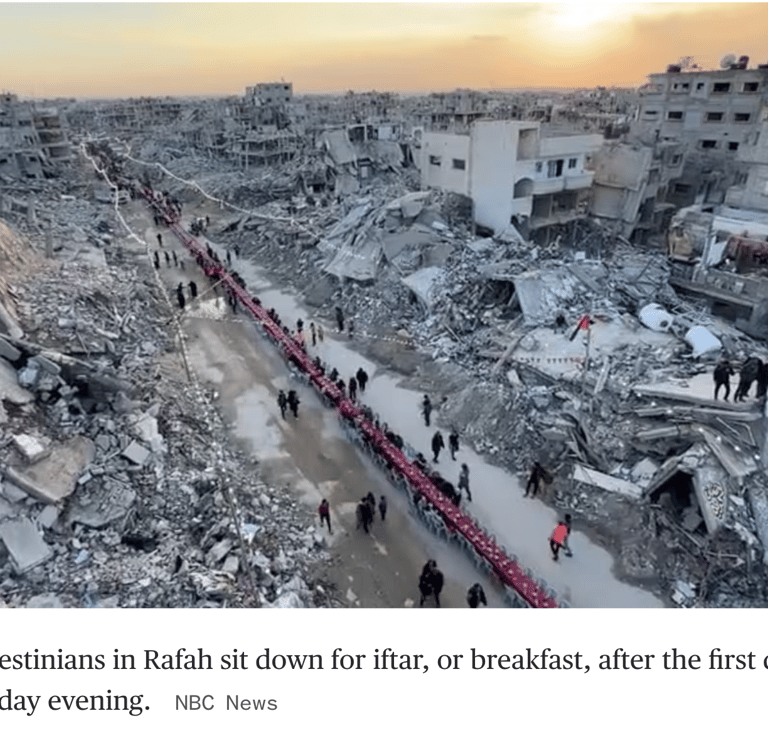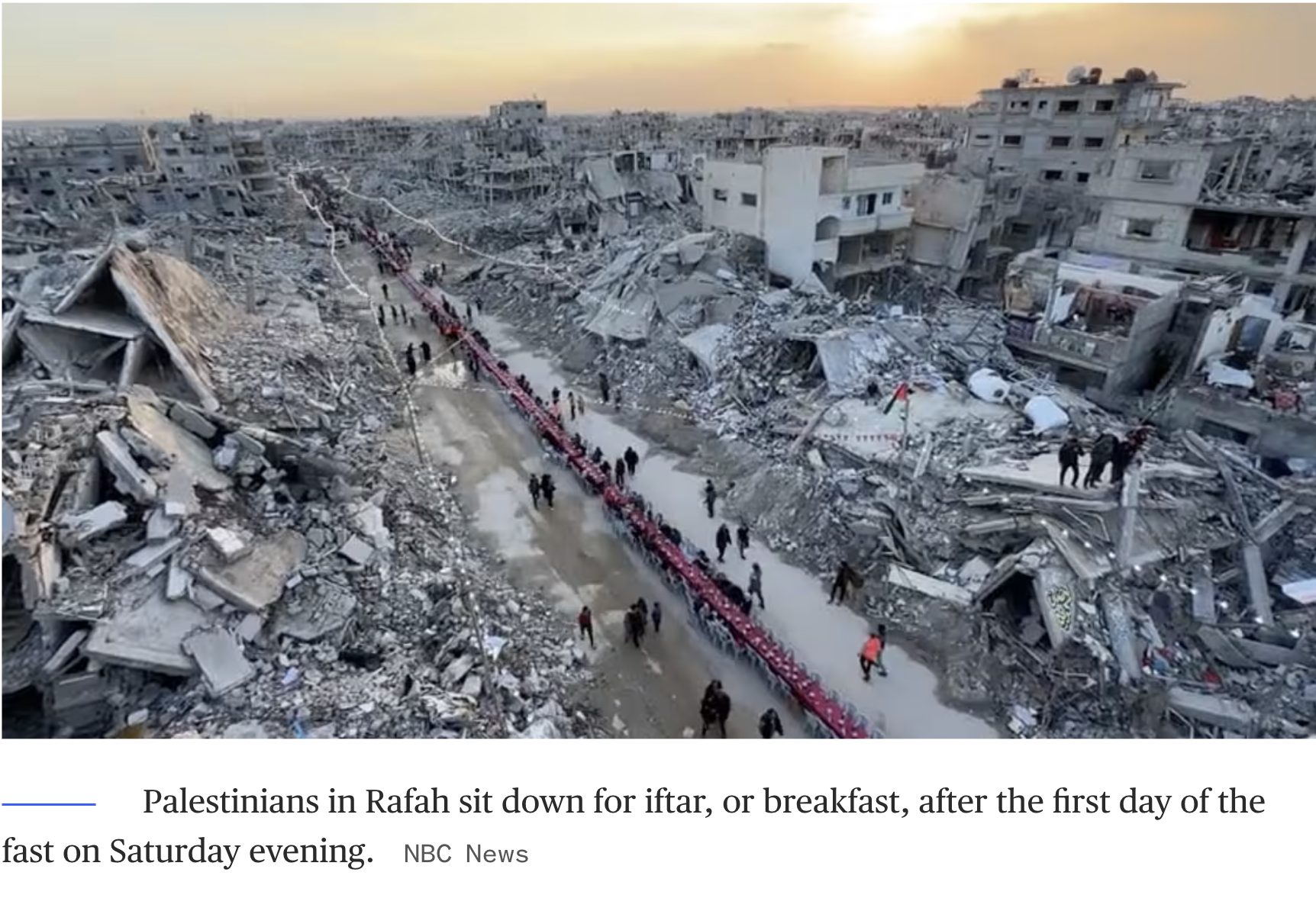 Palestinians in Gaza broke their Ramadan fast together surrounded by rubble, sharing simple meals under string lights despite catastrophic violence. These images speak to the Palestinians’ resilience and demand accountability from the world witnessing their ongoing erasure.