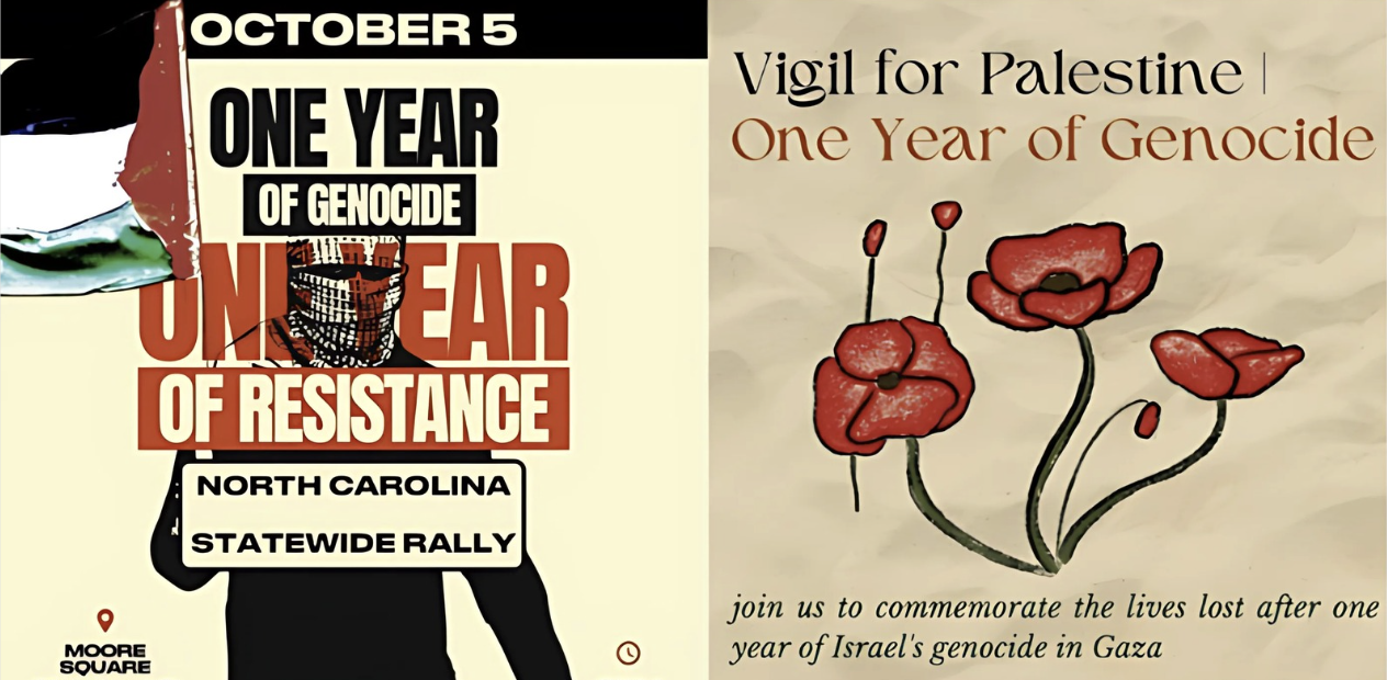 In addition to the BIG RALLY on Saturday, Oct. 5th in downtown Raleigh (see flyer below), Duke SJP will be holding a vigil at the Chapel Quad on Duke's Campus on Monday, October 7th at 6 pm.
